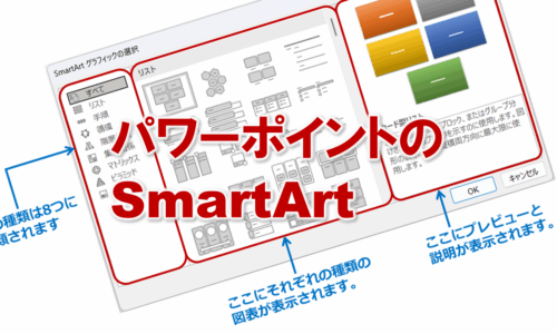 パワーポイントのSmartArtパワーポイントでスライドを作成していると、「組織図」や「フローチャート」「関係図」など、複雑な情報をわかりやすく整理し…