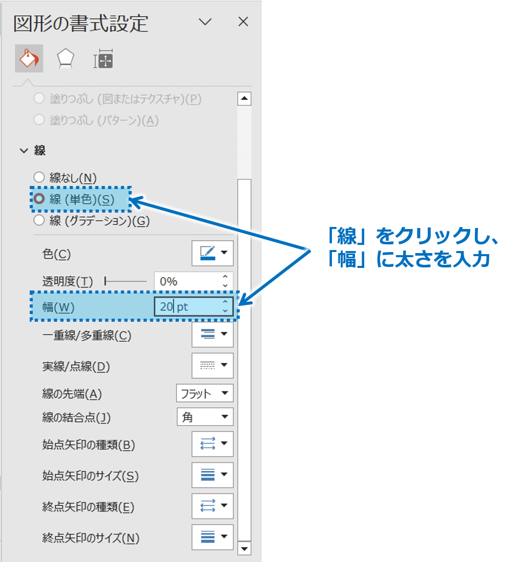 実は、「図形の書式設定」作業ウィンドウを使えば、最大1584ptまで太さを自由に設定することができます。