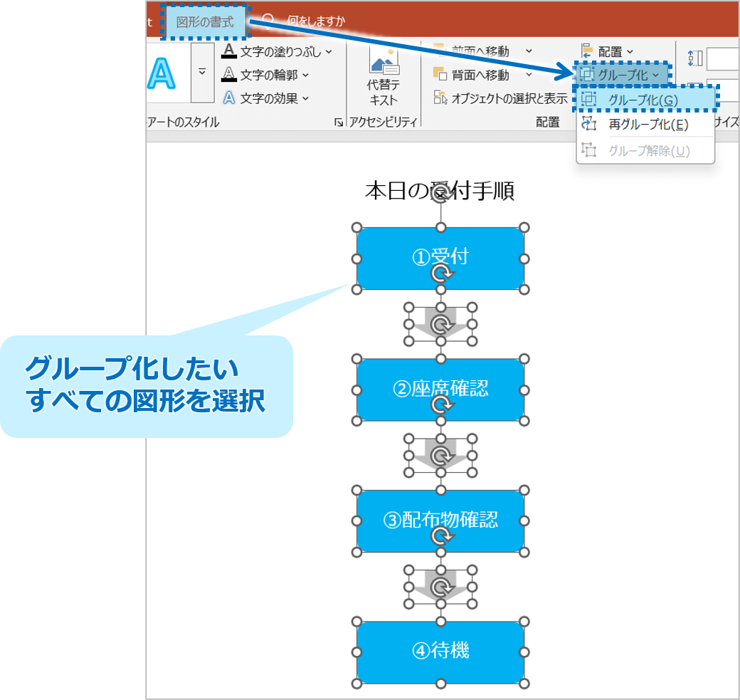 「図形の書式」タブをクリックし、「配置」グループ内にある「グループ化」ボタンをクリックし、さらに「グループ化」を選択します。
