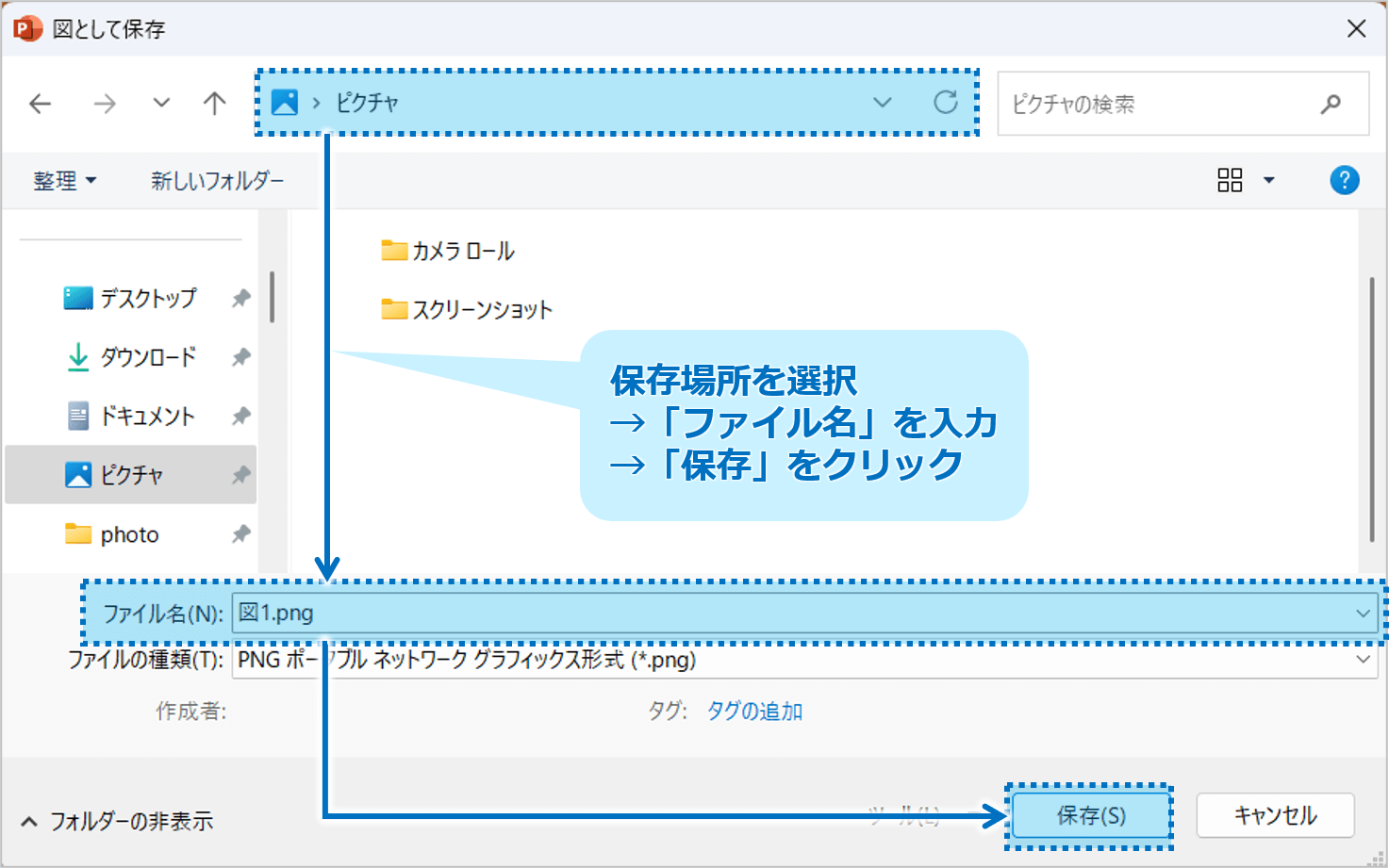 ② 「図として保存」のダイアログボックスが表示されるので、保存場所を選択し、「ファイル名」を入力して、「保存」ボタンをクリックします。