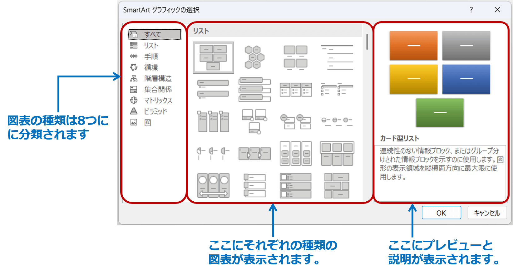 SmartArtには、用途に合わせて以下のようなカテゴリが用意されています。