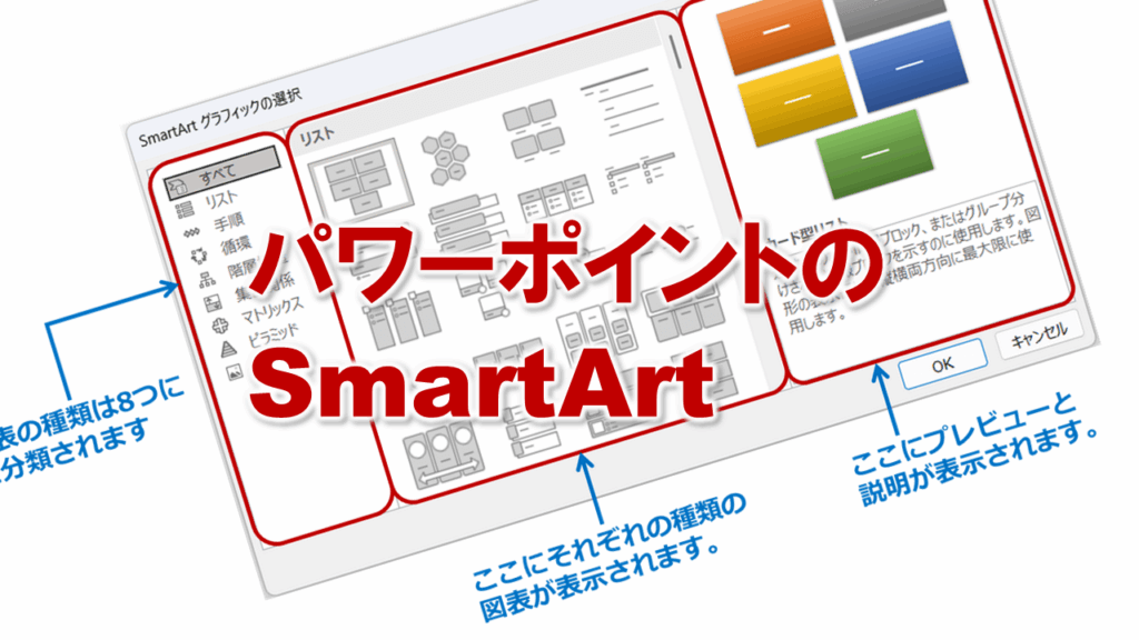 SmartArtには、用途に合わせて以下のようなカテゴリが用意されています。