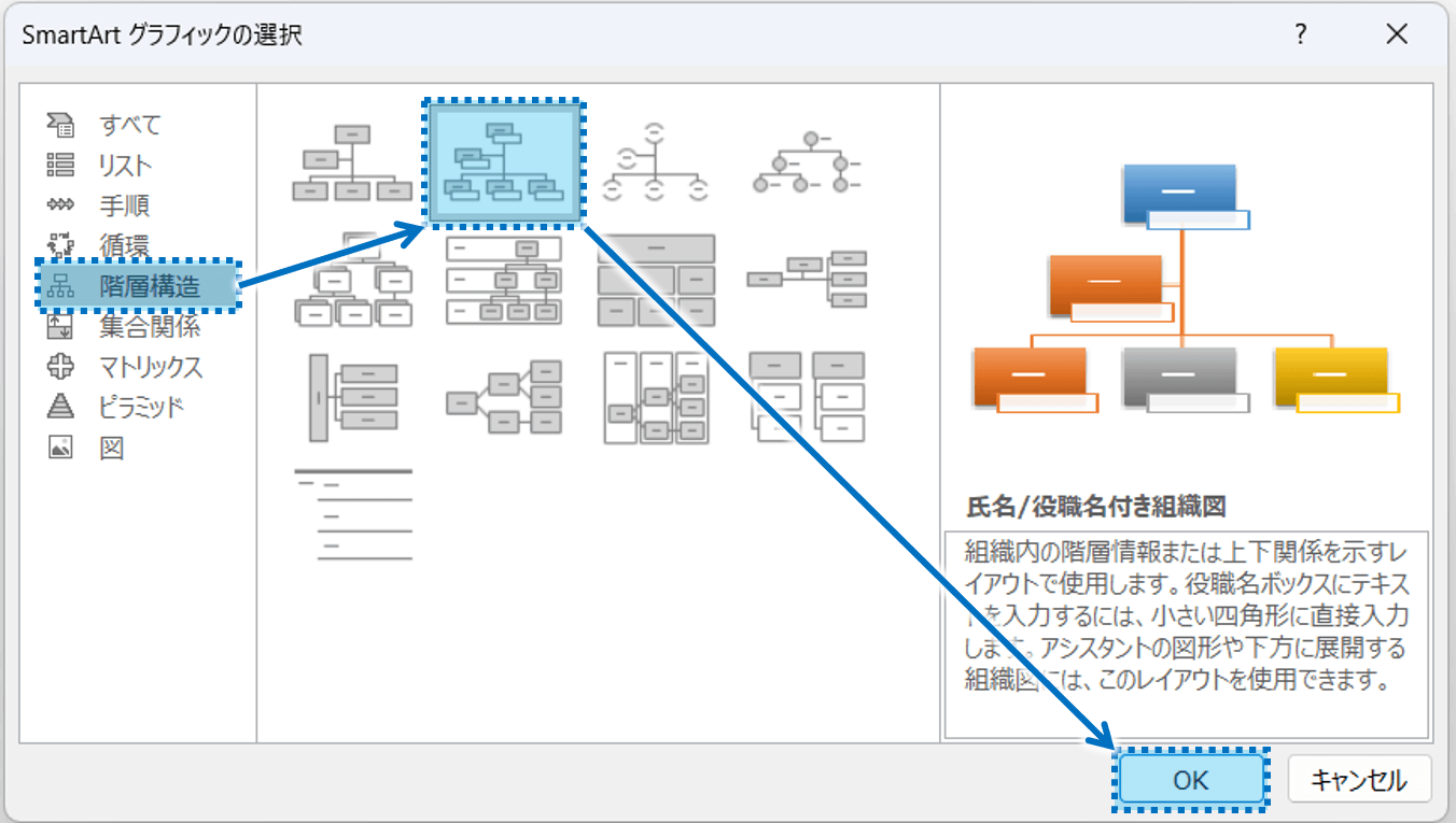「階層構造」をクリックし、デザインを選択して「OK」ボタンをクリックします。