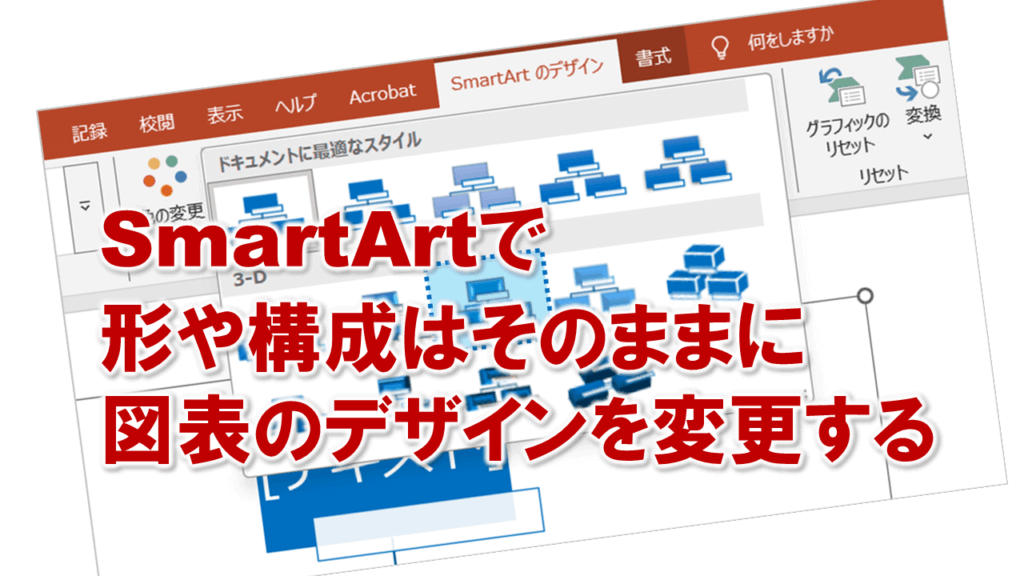 図表のレイアウトやテキストを保持したまま、デザイン(見た目)だけを簡単に変更できる便利な機能があります。