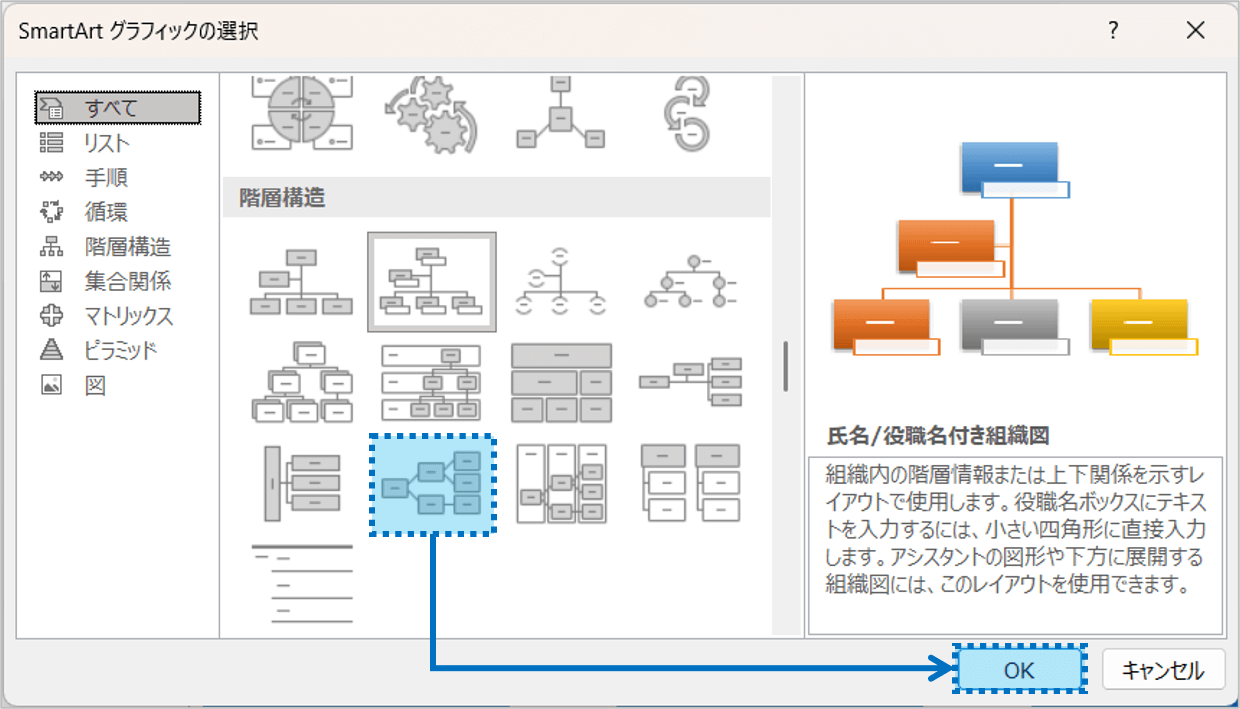 ③「SmartArtグラフィックの選択」ダイアログボックスが表示され、すべてのレイアウト(リスト・プロセス・階層構造・循環・マトリックスなど)が表示されます。