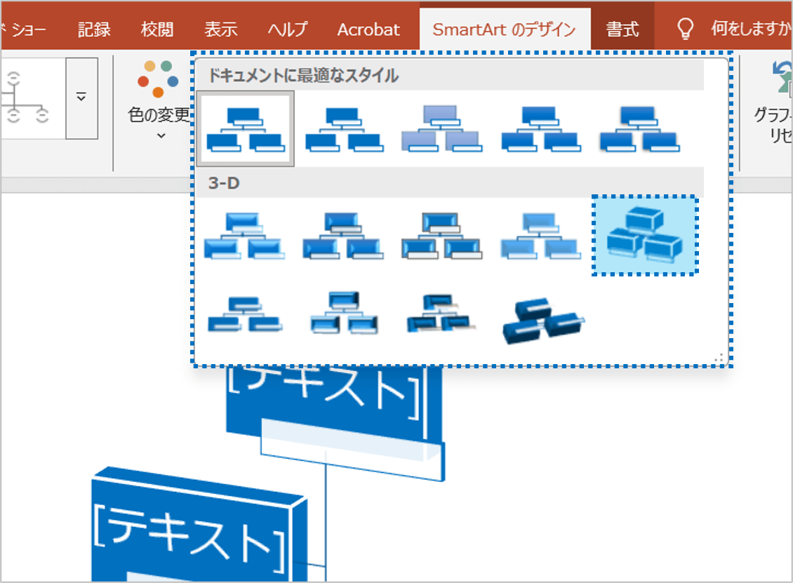 既存のSmartArtをクリックして選ぶだけで、すぐに立体的に変更できます。