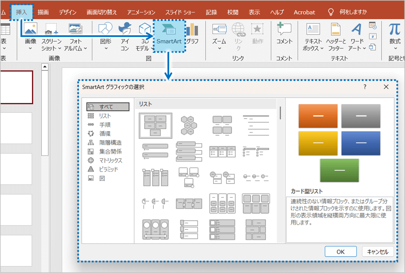 ①「挿入」タブをクリックし、「SmartArt」ボタンをクリックすると、「SmartArt グラフィックの選択」ダイアログボックスが表示されます。