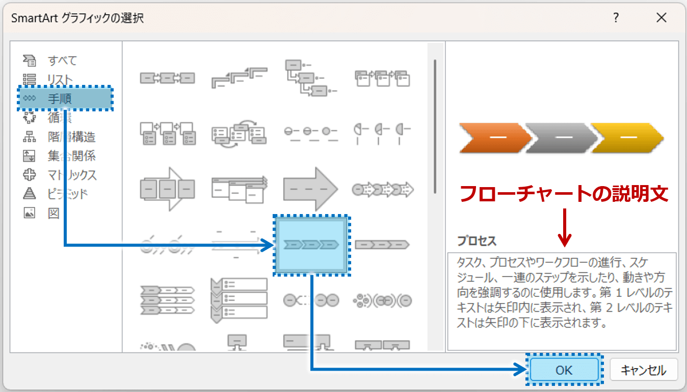 ②「SmartArt グラフィックの選択」ダイアログボックスから、「手順」をクリックするとフローチャート向けのデザイン一覧が表示されます。図表をクリックすると右側に説明文が表示されるので、目的と一致する図表を選び「OK」ボタンを押します。