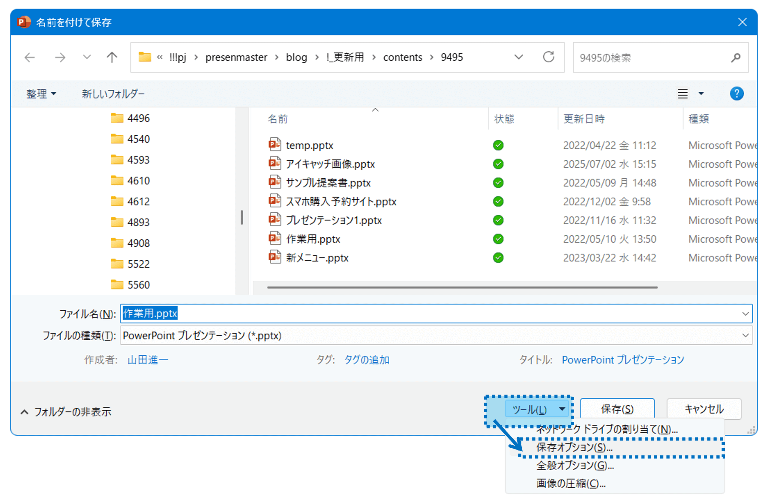 ①「名を付けて保存」から、「ツール」>「保存オプション」を選択します。
