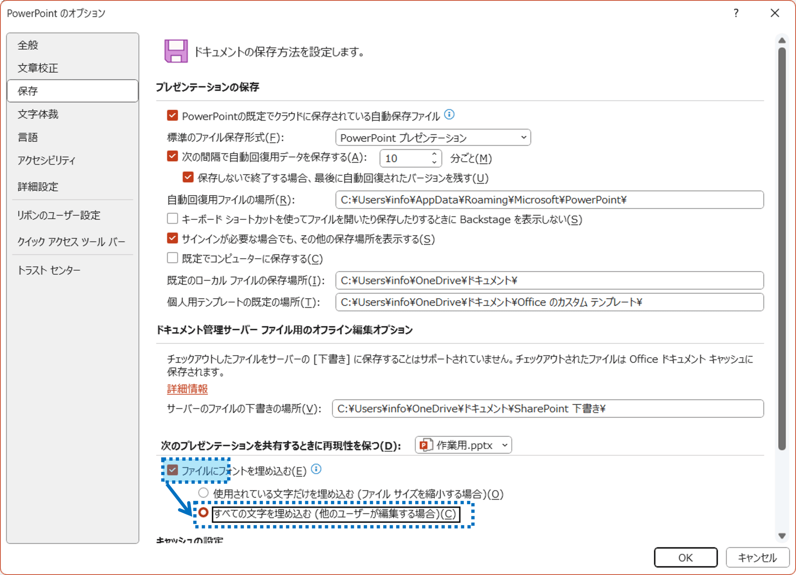 ②「保存」の「ファイルにフォントを埋め込む」をチェックし、「すべての文字を埋め込む」を選択します。