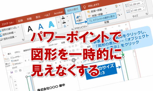 パワーポイントで図形を一時的に見えなくするパワーポイントでスライドを作成していると、図形が増えてきて画面がごちゃごちゃしてしまうこと、ありますよね。…